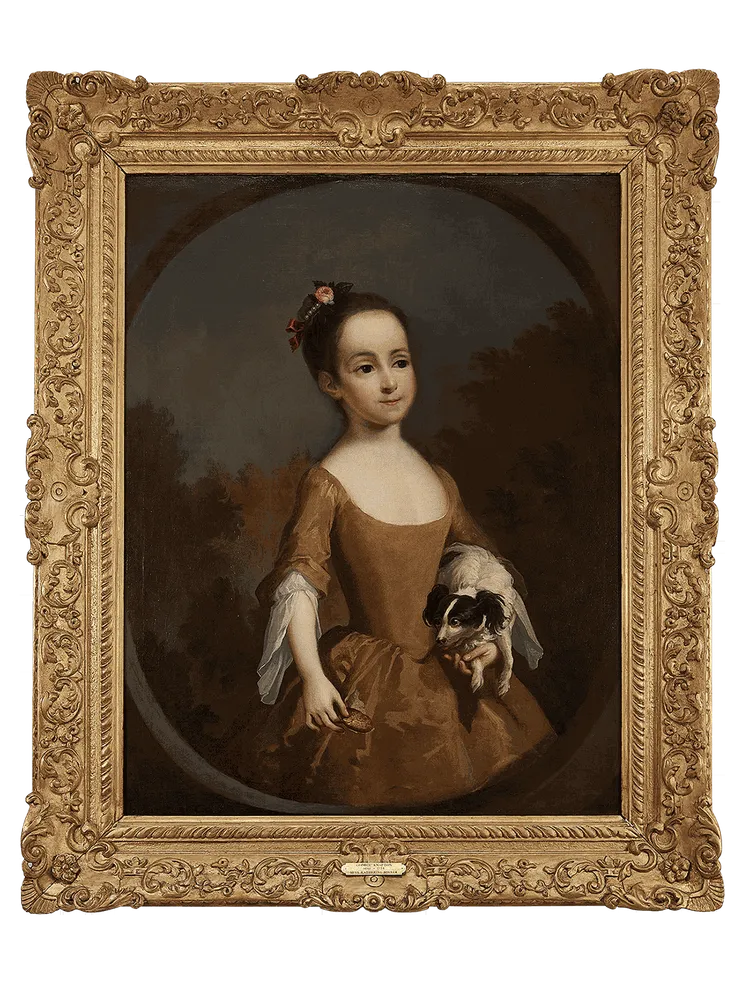Portrait of Katherine Miller as a young girl, three-quarter length in a feigned oval, wearing a gold coloured fitted silk gown, holding her pet spaniel who has his eye on a biscuit she is holding. Oil on canvas in a period giltwood frame, c. 1725. The artist has skillfully captured the wonderful sense of anticipation in the dog's expression as he eagerly awaits his treat.